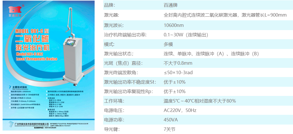 本治疗机为全封离内腔式连续波二氧化碳激光器的激光治疗机。二氧化碳激光的波长为10600nm,这种波长特别容易被人体组织吸收,故利用二氧化碳激光的热效应能有效地对人体组织汽化、碳化、凝固和照射,达到手术治疗的目的。