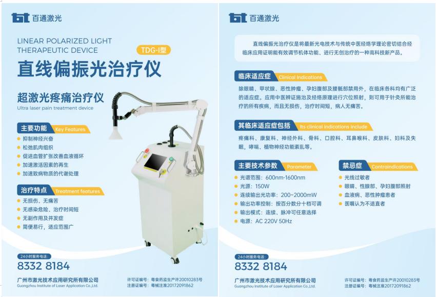直线偏振光:(商品名:超激光疼痛治疗仪)应用红外偏振光疗法光谱范围在600nm—1600nm的特殊光能作用于人体相应的疼痛部位,避激光波长单一、治疗功效低之缺陷、取近红外线穿透力强、复合波长带之精华,避近红外线散射、易吸收、无偏振光之缺陷,有效作用深度可达5cm-7cm,显著治疗急/慢性神经炎,创伤性、炎症痛疼。